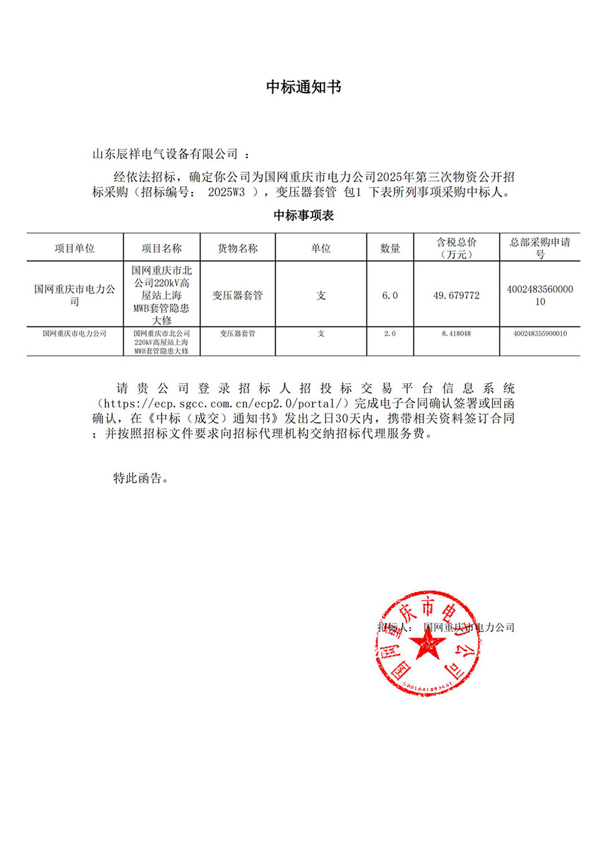 • 2025.02.14 110kV瓷絕緣穿墻套管中標通知書